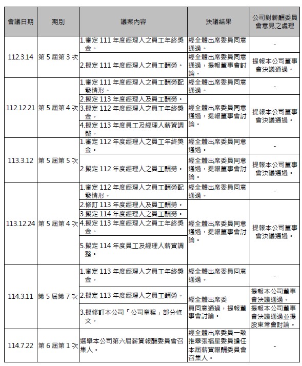 本公司「薪資報酬委員會」職司訂定並定期檢討評估本公司董事及經理人績效評估與薪資報酬之政策、制度、標準與結構及其所領之酬金,並將所提建議提交董事會討論。薪資報酬委員會每年至少召開二次。配合2025年董事會改選,董事會於2025年7月22日通過委任3位獨立董事擔任第6屆薪資報酬委員會委員,並由張福星先生擔任召集人,2024年第5屆委員會共召開2次會議,全體出席率達100%。有關本委員會會議召開情形及每位委員的出席率資訊,請參考本公司各年度年報。