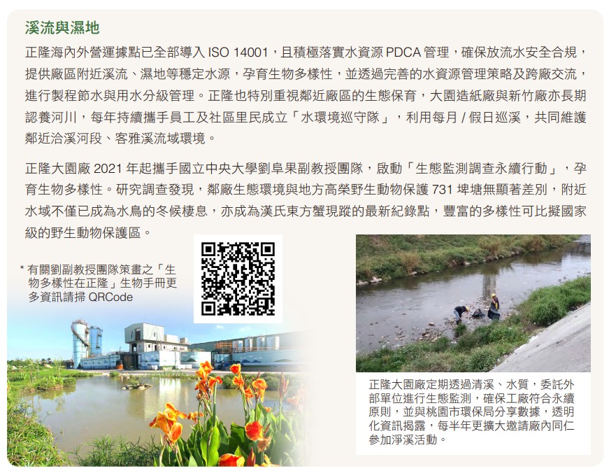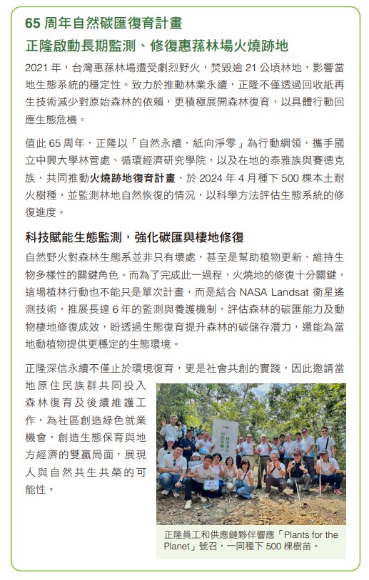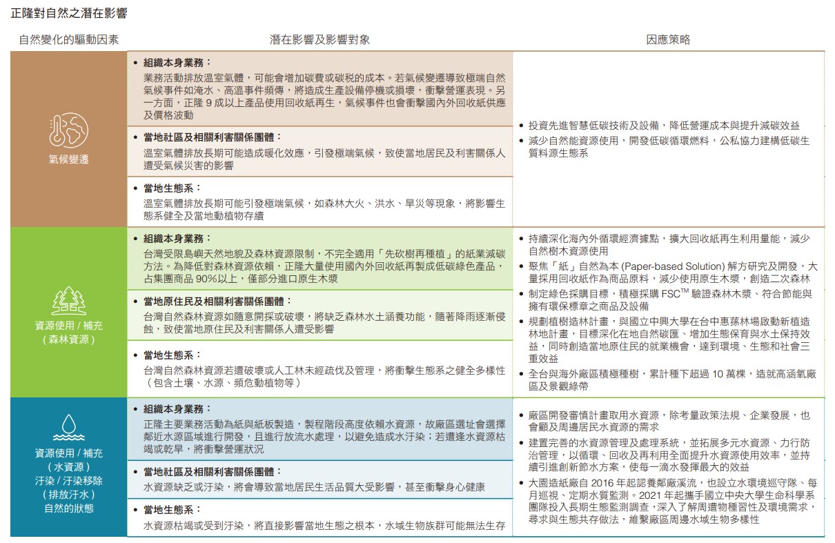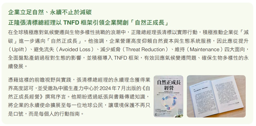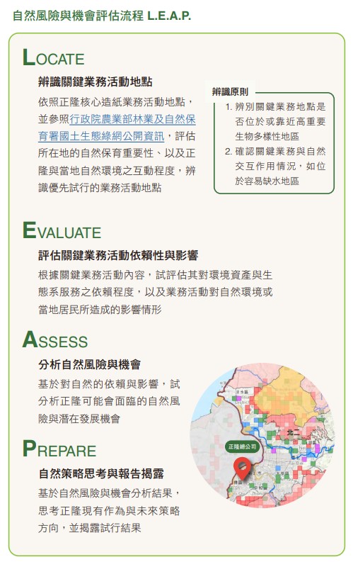 面對(duì)全球氣候變遷與自然資源有限的挑戰(zhàn),正隆以前瞻視野落實(shí)「Nature Positive(自然正成長(zhǎng))」願(yuàn)景,積極響應(yīng)國(guó)際ESG氣候相關(guān)倡議與生物多樣性議題。2023年,正隆簽署支持「自然相關(guān)財(cái)務(wù)揭露」(Taskforce on Nature-related Financial Disclosures, TNFD),並在2024年成為入列TNFD先行者企業(yè)(Early Adopter)的第一家臺(tái)灣造紙業(yè),正式展開(kāi)自然資本風(fēng)險(xiǎn)評(píng)估與策略布局。