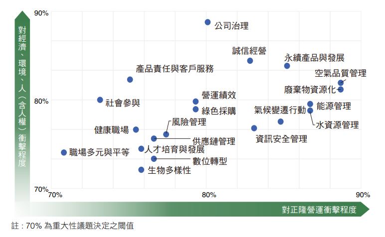 有鑑於資安風(fēng)控重要性日增,本公司2023年新增1個高度重大主題「資訊安全管理」,結(jié)合誠信經(jīng)營、永續(xù)產(chǎn)品與發(fā)展、氣候變遷行動、廢棄物資源化等高度重大主題,繪製重大議題矩陣並進(jìn)行回應(yīng)。鑑別出重大議題後,由內(nèi)部高階主管與ESG小組成員進(jìn)一步針對20項重大主題進(jìn)行正負(fù)面衝擊分析執(zhí)行「盡職調(diào)查」,評估重大主題於正隆價值鏈的影響範(fàn)疇,並於ESG委員會提報董事會,會議決議後通過決定出重大議題。正面衝擊以公司目前策略與管理方針評估各項議題,對經(jīng)濟(jì)、環(huán)境及人(含人權(quán))三面向所產(chǎn)生之正面效益及發(fā)生可能性,負(fù)面衝擊假設(shè)組織不採取行動,導(dǎo)致未能預(yù)防或減緩負(fù)面衝擊,以評估各項議題於三面向所造成的嚴(yán)重程度及發(fā)生可能性。