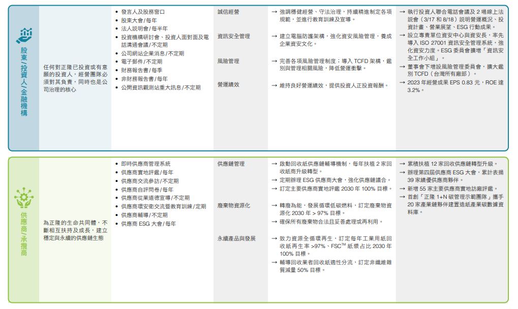 正隆藉由本報告書回應(yīng)六大利害關(guān)係人關(guān)注議題,並透過官網(wǎng)和多項平臺揭露相關(guān)資訊,促進(jìn)與利害關(guān)係人正向交流。正隆ESG委員會每年向董事會報告與利害關(guān)係人溝通情形,2023年度議合成果已於2024年3月12日提報董事會,相關(guān)內(nèi)容如下: