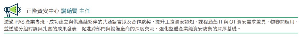 - 3. 與經濟部合作開辦 iPAS 供應鏈專班課程,課程內容涵蓋「智慧製造」與 「工控資安」進行培訓,藉此提升供應鏈資安防護能力。課程聚焦於工控資安概念及 IEC62443 工控資安標準,提升產線運作的安全意識,並在與設備供應商合作時,確保資安要求的落實。此外,透過分組討論與跨部門、跨廠參與,深化內外部合作默契。專班不僅提供實用知識,還促進供應鏈夥伴與內部團隊的互動交流,為未來合作奠定基礎。