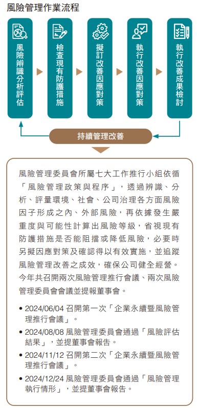 執行風險管理制度與運作是確保正隆穩定營運的重要根基。為完善風險管理制度,正隆成立直屬董事會之「風險管理委員會」,所屬七大工作推行小組依循「風險管理政策與程序 」,透過辨識、分析、評量環境、社會、公司治理各方面風險因子形成之內、外部風險,再依據發生嚴重度與可能性計算出風險等級,省視現有防護措施是否能阻擋或降低風險,必要時另擬因應對策及確認得以有效實施,並追蹤風險管理改善之成效,確保公司健全經營,風險評估之邊界主要以合併公司為主,包含臺灣、中國大陸、越南既有營業據點。2024年共召開兩次風險管理委員會會議並提報董事會。