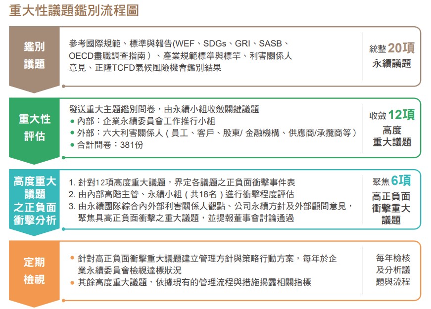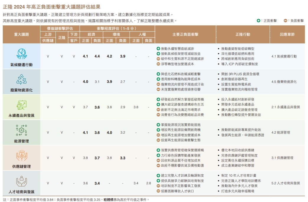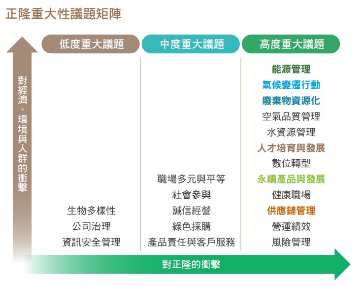 正隆蒐集利害關係人及內外部專家關注議題,檢視利害關係人分類及其關切議題之合適性予以調整。2024年向內外部利害關係人發(fā)送重大議題鑑別問卷,針對20項正隆永續(xù)議題進行評估,將「對正隆」以及「對經(jīng)濟、環(huán)境、人群」皆有顯著衝擊的議題定義為「高度重大議題」,並由永續(xù)小組收斂為12項,繪製重大性議題矩陣。接著由永續(xù)團隊及外部專家針對高度重大議題,界定其對於經(jīng)濟、環(huán)境及人群(含人權)三面向之正負面衝擊事件表,由內部高階主管與永續(xù)小組成員就事件影響之規(guī)模、範疇進行影響程度及發(fā)生可能性之評估;正面衝擊事件應考量事件如何帶來財務或營運效益,負面衝擊事件則考量事件如何等對公司造成不良影響,如財務減損或營運衝擊,最終由永續(xù)團隊綜合內外部利害關係人觀點、公司永續(xù)方針及外部永續(xù)顧問意見,聚焦6項高度正負面衝擊議題, 包含氣候變遷行動、能源管理、廢棄物資源化、永續(xù)產(chǎn)品與發(fā)展、供應鏈管理和人才培育與發(fā)展,重大議題鑑別與衝擊分析結果經(jīng)提報董事會討論通過。