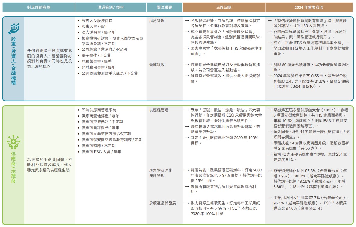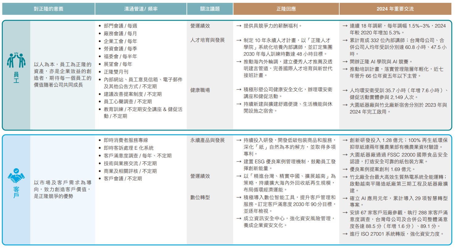 正隆藉由本報告書回應六大利害關係人關注之高度重大議題,並透過官網(wǎng)和多項平臺揭露相關資訊,促進與利害關係人正向交流。正隆企業(yè)委員會每年向董事會報告與利害關係人溝通情形,2024年度議合成果已於2025年3月12日提報董事會,相關內容如下:
