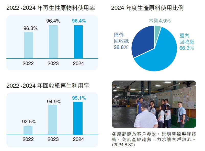 ? 再生性原物料使用率96.4%:使用國內回收紙約115.5萬公噸、國外回收紙54.5萬公噸,原生木漿近8.6萬公噸,以及其他植物性原料如澱粉、樹薯粉等,合計使用174.6萬公噸再生性原物料;非再生性原物料包含造紙添加化學藥劑等,約為6.6萬公噸。