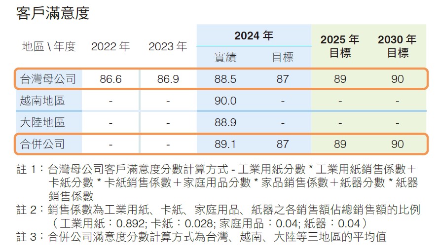 正隆建立完善的客戶管理制度,每年進行滿意度調查,針對低分項目採取改善措施,持續強化客戶服務。鑒於越南為海外發展重點,臺灣成熟的調查制度也同步推展至其他海外廠部,2024年起增訂「合併公司」客戶滿意度之中長期目標,分別為:2030年客戶滿意度90分(臺灣母公司、合併公司)、2025年客戶滿意度89分(臺灣母公司、合併公司)。2024年,臺灣母公司客戶滿意度為88.5分(目標 87 分);海外部分,越南地區客戶滿意度為90分,大陸地區客戶滿意度為88.9分;總計合併公司客戶滿意度為89.1分(目標87分)。未來,公司仍將持續透過強化客戶服務、落實生產績效與導入數位管理,致力達成所訂定的客戶滿意度目標。
