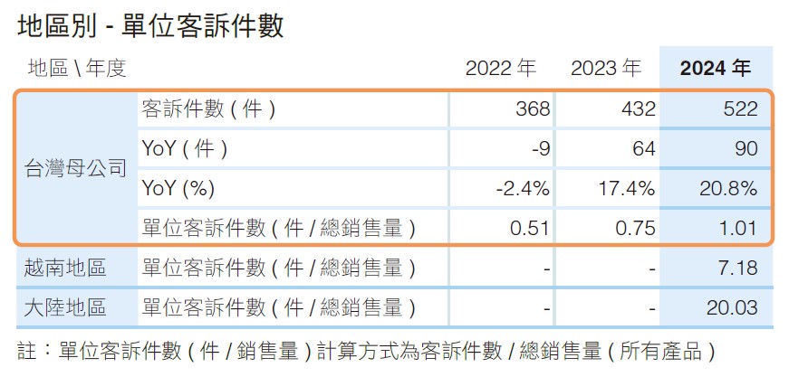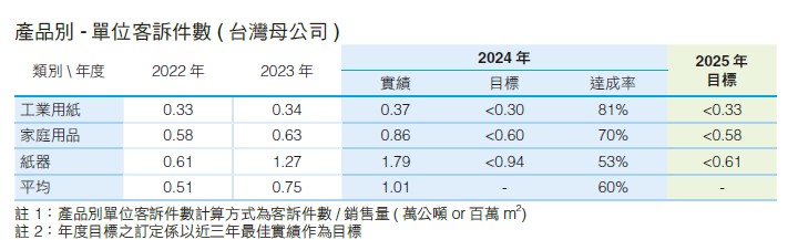 在客訴管理上,正隆臺灣母公司訂定2024年產品別單位客訴件數管理目標,分別為:工業用紙<0.30 件 / 萬公噸、家庭用品 <0.60 件 / 萬公噸,以及紙器 <0.94 件 / 百萬 m2 。達成狀況為:工業用紙目標達 成率 81% ( 平均 0.37 件 )、家庭用品 70% ( 平均 0.86 件 )、紙器 53% ( 平均 1.79 件 ),整體達成率為 60%。其中,2024 年客訴件數共有 522 件,較前一年度增加 90 件;客訴件數增多以及產品別單位客訴 件數未能達標主因為卡紙紙面拔起、家庭用紙包裝數量短缺,與紙器貼合不良等因素。海外越南方面, 工業用紙單位客訴件數為 0.14 件 / 萬公噸,客訴原因多為原紙摺痕;紙器單位客訴件數為 14.21 件 / 百 萬 m2 ,原因主要為翹曲。大陸部分,紙器單位客訴件數為 20.03 件 / 百萬 m2 ,主要為印刷不良。