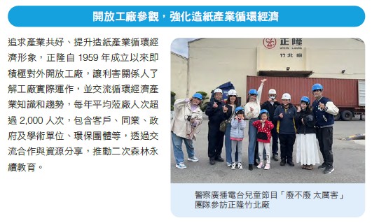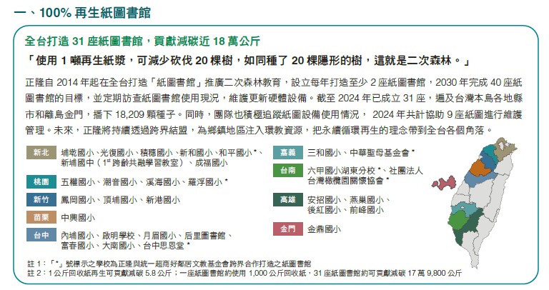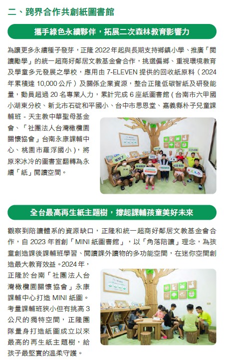 每一張紙都是樹木的延伸,回收紙可以創造二次森林。深信基礎教育是促使資源正確循環再生的動力,正隆積極呼應聯合國SDGs 4優質教育願景,自2014年起在全臺打造「紙圖書館」,為偏鄉注入閱讀與環教資源,讓師生得以透過閱讀、認識與接觸紙資源,學會守護與珍惜環境的美好。近年來,正隆積極透過串接多方利害關係人,以共創紙圖書館、推動永續教師研習營、開放工廠參觀等多元創新模式,為社會扎根二次森林永續價值。
