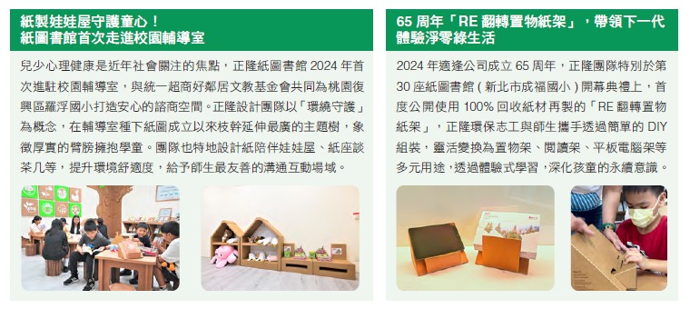 關注「閱讀」與「陪伴」對孩童心理健康成長的重要性,正隆持續開拓永續紙材在各式多元場域的應用。2024年首度將紙圖書館的概念運用在改造學校輔導室,在教育學習的基礎上,提供師生溫暖的諮商與溝通空間,盼在學童心中種下美好永續種子,為臺灣成為國際永續典範奠定良好基礎。