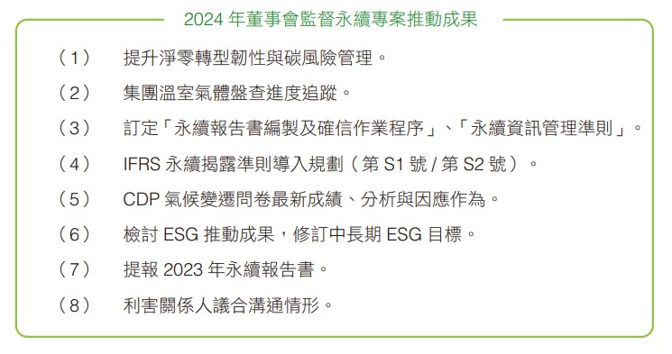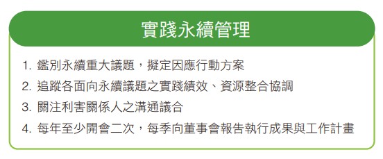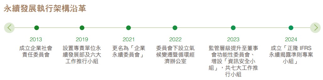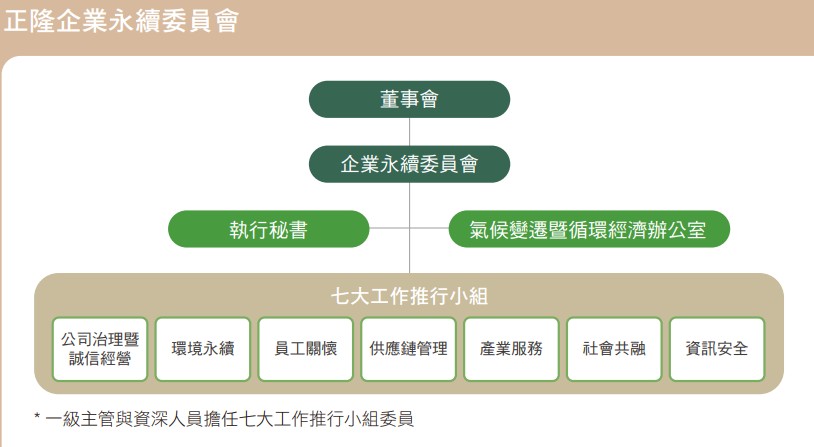 正隆董事會為推動永續發展事務之最高決策督導單位,每年透過企業永續委員會以及委員會執行秘書呈報內容,確認永續專案推動現況,商討管理方針,監督及檢討執行情形。正隆企業永續發展委員會下轄七大工作推行小組,包含公司治理暨誠信經營、環境永續、員工關懷、供應鏈管理、產業服務、社會共融及資訊安全小組,由各相關部門一級主管與資深人員組成, 依部門職能指派 ESG 相關業務,並擴及子公司。委員會下亦設置「氣候變遷暨循環經濟辦公室」,由總經理擔任召集人、研發主管擔任副召集人,並積極諮詢外部專業單位,包含臺灣綠色生產力基金會等,工作推行小組每月定期召開會議追蹤工作進度與執行成效,且每季向董事會報告。為提升董事永續管理之專業與持續充實新知,董事會每年皆安排董事進修企業永續發展相關課程。